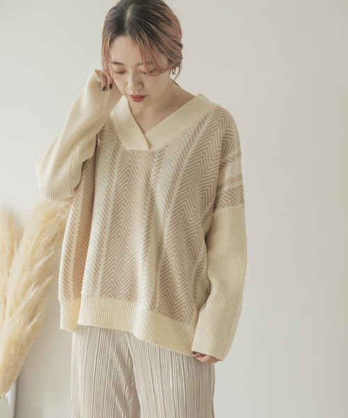 ヘリンボーンデザインを落とし込んだ独特なニュアンスが目を引くニットプルオーバー。ざっくりとしたVネックで、デコルテラインが綺麗に見える女性らしいディテールがポイント◎ゆったりとしたシルエットながらも、肘上あたりから細身のリブ袖に切り替えたこだわりの光るデザインにも注目です。 ----------------------------- 《スタッフ着用コメント》 [スタッフA] 年齢 : 20代後半, 身長 : 161cm, 体型 : 普通/骨格ウェーブ 普段の着用サイズ : M 【着用カラー/サイズ】GRN/FREE 【サイズ感】ゆったりしたサイズ感です◎深めのVネックなのでブラウスやカットソーと合わせて頂くのがオススメです! 【素材感・着心地】程よく厚みがあるので冬まで長くお使い頂けます。 ----------------------------- ※この商品は素材の特性上、ピリング(毛玉)が発生します。発生したピリングは、小バサミなどを使い元糸を傷つけないように注意して除去してください。 ※着用時はベルト・バッグ・アクセサリー・壁など、表面の粗いものとの接触や摩擦にご注意ください。 ※その他お取り扱いに関しましては、商品に付属のアテンションタグをご覧ください。 ※商品画像は、光の当たり具合やパソコンなどの閲覧環境により、実際の色味と異なって見える場合がございます。予めご了承ください。 ※商品の色味の目安は、商品単体の画像をご参照ください。 ----------------------------- 透け感:なし 伸縮性:ややあり 裏地:なし 光沢:なし ポケット:なし -----------------------------