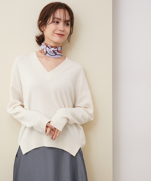 【素材】毎シーズン好評いただいているウールカシミアです。 紡毛のハイゲージが程よい肉感で、シーズン長く着用頂ける点がオススメポイント。程よく肉厚なので1枚でも着用でき、ロンTやシャツとのレイヤードスタイルはもちろんコートINのニットとしても嵩張らない素材感がとても便利な1枚です。ウールとカシミヤ素材でご自宅で手洗い可能なので嬉しいですよね。【デザイン・シルエット】スッキリとした太巾のVネックで、よりデコルテがすっきりと見えます。 脇線をフロントに振り、前後差寸を付けることで自然にフォルムが出るように仕上げています。 裾リブにスリットを入れることで、より印象的に仕上げています。柔らかい生地感で、その人の体型に馴染みやすく脇の切り替えラインが前身頃にふってあるので細く見せてくれます。身体のラインを拾わないゆったりシルエットだけど、シャープなVネックなので細く見えるバランスに仕上がっています。首元のVネックが程よい深さでお仕事でも安心して着用いただけます。サイドにスリットが入っているのでINせずOUTでも腰回りをスッキリ見せてくれます。【カラー】トレンド感のあるピンクをアクセントカラーで展開【その他のポイント】カシミアブレンドシリーズで、クルーネックタイプのカシミアブレンドクルーネックニット(品番:GGM31320)もございます。【おすすめのスタイリング】きれいめにもカジュアルにも合わせやすいベーシックVネックで、 幅広いコーディネイトに合わせられます。ゆったりめですが柔らかいのでボリュームが出すぎず、イン、アウトどちらでもコーディネートがしやすいです。カシミヤ混なので軽くて暖かい、手洗いも可能で気軽に着用できます。前身ごろの裾がアーチになっているので、小柄なお客様でもウエスト位置が高く見えバランスが良いニットです◎バランス良いシルエットなのでボトムスは、パンツ・スカート問わず合わせやすいですよ。とても軽くて着心地抜群◎ニットはチクチクする事もありますが、こちらのニットはとても柔らかくチクチク感もなく着用いただけます。大きくず小さすぎず程よくゆとりのあるニットで両サイドのスリットがすっきりと見せてくれます。----------------------------透け感:なし裏地:なし伸縮性:少しあり光沢感:なし生地の厚さ:中肉ポケット:なしポケット数:なし洗濯方法:手洗い----------------------------【モデル情報】モデル身長:167cm 着用サイズ:38※画像の商品はサンプルです。 実際の商品と仕様、加工、サイズが若干異なる場合がございます。※室外で撮影している画像は、光の影響で色味が若干異なって見える場合がございます。※商品の入荷状況は、店舗までお問い合わせをお願いいたします。店舗での商品のお取り扱いについてROPE'の商品は、ROPE'実店舗のみの取り扱いになります。