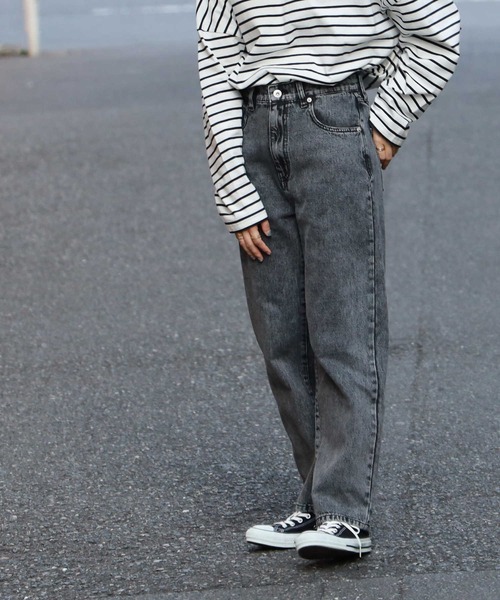 トレンドのハイウエストデニム。 インナーをINするスタイルやショート丈のトップスと相性抜群です。 程よいゆったりシルエットなので楽ちんに着用ができ、軽さも特徴の一つです。