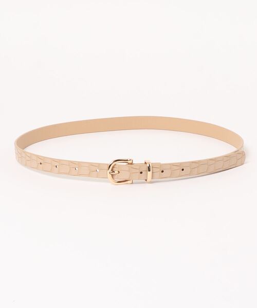 ★WEB限定アイテム★ キレイめスタイルにも合わせやすいフェイクレザーのベルトは型押しデザインがスタイリッシュ。細めの帯でパンツに合わせるのはもちろん、ワンピースやシャツのウエストマークにも使えます。リュクスな輝きを放つゴールドの金具もポイント。落ち着いたカラーが揃っているのでどんなコーディネイトにも相性抜群。シーズンレスで活躍します。・合成皮革