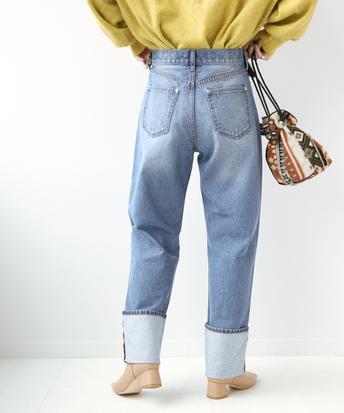 【2021AW】 B.C STOCK 今季トレンドの、ロールアップデザインパンツの登場です! 深めのロールアップデザインで、ベーシックなトップスと合わせてもオシャレに決まる一枚です。 ロールアップのバランスを変えて着られるので、幅広い身長の方にお楽しみ頂けます。 普段と一味違うトレンドデニム、今期のワードローブに加えてみてはいかがでしょうか。 ********************** 透け感:なし 裏地:なし 伸縮性:なし 光沢感:なし 生地の厚さ:普通 ********************** 【スタッフ着用コメント】 《スタッフ staff.s》 身長:165cm/普段サイズ:S~M/着用サイズ:M サイズ感:薄手のニットをインして、ちょうど良いサイズ感でした。 素材感:伸縮性はなく、綿100%なので膝の部分が伸びる心配も無さそうです。 着心地: ストレートシルエットのため、座っていても窮屈な感じはありませんでした。 ********************** ※サイズ詳細の【パンツ丈】【股下】は、裾をロールアップした状態での数値です。 ※取り扱いについては、商品についている品質表示でご確認ください。 ・色落ちすることがありますので、お洗濯の際は単独で洗ってください。 ※店頭・屋外での撮影画像は、光の当たり具合で色味が違って見える場合があります。商品の色味は、スタジオ撮影の画像をご参照ください。 モデルサイズ:H165 着用サイズ:M 本体:洗濯機洗い(弱)