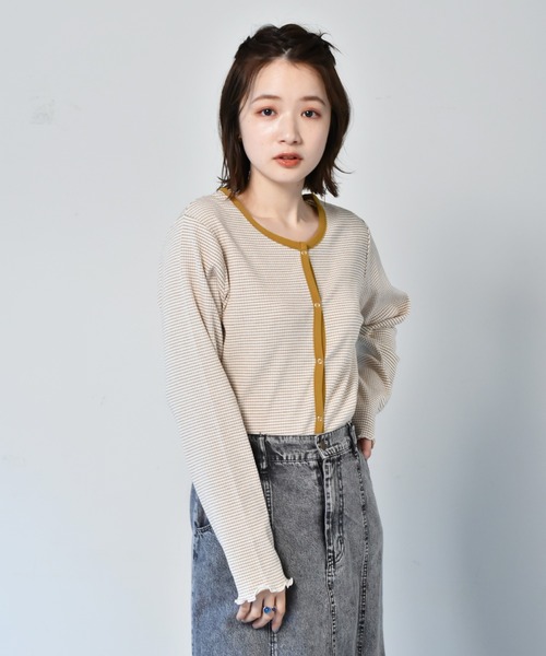 配色デザインが可愛い!ショートカーディガン コーディネートのプラスワンアイテムとして活躍するショート丈カーディガン 朝晩の気温が変わりやすい今のシーズンから長く活躍します。 カーディガンとしてはもちろん、前をしめてトップスとしても。 細かなボーダー柄にアクセントになる配色デザインも魅力です。 豊富なカラー展開で何枚も欲しくなる存在感のあるカーディガンは、一つ持っておくと大変重宝します! ※撮影環境やご覧のモニター環境によって実際の商品とお色味が多少異なってみえる場合がございます。ご理解の程何卒よろしくお願い致します。