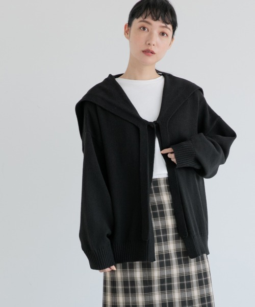 ◆素材 ふくらみ感のあるポリエステル混のコットン素材です。ややツヤのある素材をミドルゲージにしてカジュアルに仕上げています。 ◆デザイン セーラーカラーの着流しカーディガン。前中心のリボンがアクセントになっています。実用的に着やすいように釦を リボン下につけています。 ◆スタイリング 気温が高いときはタンクトップ、寒くなってくるとロング丈のTシャツやシアータートルをレイヤードしてプルオーバーとして 着用するのがおすすめです。ボトムスはセミワイドパンツ、テーパードパンツ、スカートの場合はマーメイドスカートや すっきりとしたシルエットのものがおすすめです。