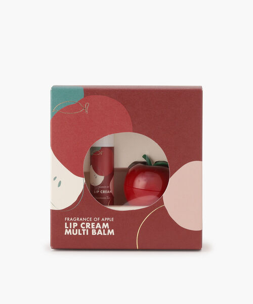 ギフトにもぴったりなリップクリームとマルチバームのセットです。甘くてジューシーな香りに癒されるアップルシリーズ。間引きしたりんごの実を有効活用した、地球や環境に配慮されたサステナブルなアイテムです。ベビーアップルエキスに3種のセラミドと8種のアミノ酸を配合したこだわりの処方で、しっとりと潤いのある肌、唇、髪に整えます。リップクリームはベーシックで塗りやすいスティックタイプ。マルチバームはころんとしたかわいらしいりんご型の容器に入っています。どちらもポーチに入れてコンパクトに携帯でき、外出先でも気軽にお使いいただけます。 *本品は食べられません。 *【箱】縦11cm/横10.2cm/厚み4cm *【リップクリーム】縦6.7cm/直径1.6cm *【マルチバーム】縦3.5cm/直径3.8cm