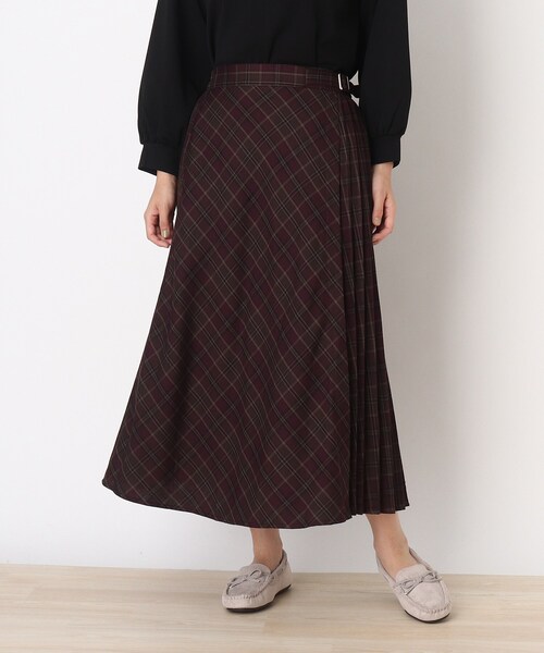 【デザイン】サイドプリーツやベルトデザインで大人っぽく仕上げた、チェック柄スカートです。長めの着丈で、大人っぽい印象で着て頂けます。巻きスカート風に見えて、実は内側でつながったデザインでめくれる心配も無く安心して着て頂けます。※ポケット数:横×1【生地感】ソフトで優しい肌触りです。※裏地あり【スタッフ着用コメント】季節を感じられるチェック柄がかわいい1枚です。サイドプリーツがおしゃれ見えしますよ!ママ目線で見てみると、何かと便利なポケットが付いているのがとっても◎ボルドーカラーにはベージュやブラウンを合わせるとこっくり感が出て暖かみのある印象に。モデル情報:身長163cm B80 W60 H88 着用サイズ:02(M)店舗へのお問い合わせ商品番号:741-73013●製品寸法:02(M):W66~72cm H86cm 総丈85cm03(L):W68~74cm H89cm 総丈85cm04(LL):W70~76cm H92cm 総丈85cm備考: