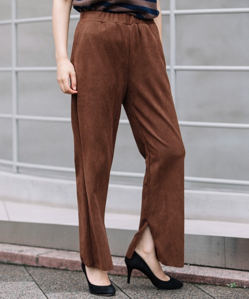 □2021 AUTUMN & WINTER COLLECTION□ ◆美脚シルエットとトレンド感を兼ね備えたオトナのためのフレアパンツ◆ <MATERIAL> リサイクルポリエステルを使ったGRS認証を取得しているメーカーと開発した新素材サスティナブルスウェードです。 ファッション性はそのままに環境に負荷をかけない原料を選定しています。 ぱっと見で秋を感じられるスエードで、着心地の良いジャージ素材にこだわりました。 スウェード特有の柔らかなタッチと落ち感は残しつつ、程良い肉感と張りを加えた新しさのある素材感で、アイテムを選ばずオールマイティーにこなせます。 ミニコーデュロイ風の表面感で、トレンド感あふれる素材です。 <DESIGN> サスティナブルピケスエードを使用した、キレイ目にも使える楽ちんカジュアルパンツです。 表面感のあるピケ素材の雰囲気を生かした、スッキリとしたシルエットのカジュアルパンツです。 211SSで展開した人気のパンツ(ブランド品番:MN211P27)をベースに、わたり巾、ひざ巾、裾巾も少し調整して、全体的にスッキリと見えるシルエットにアップデートしました。 内裾にスリットを入れる事でほんのりフレアーシルエットな見え方になっている為、細見え効果もあり、ただのカジュアルパンツではなく、キレイ目にも使えるパンツに仕上げています。 ウエストはオールゴムでらくちんですが、前ベルトはギャザーを寄せてないデザインなので、前だけインしてもスッキリと着こなせます。 裾のスリットはメロー始末で軽く仕上げているので、同素材のワンピース(ブランド品番:MN212U30)とレイヤードしても同化せず、アクセントになります。 <COLOR> ■アイボリー:ごく僅かにクリーム色をのせた、やわらかい印象のアイボリーカラー。秋冬の着こなしを軽やかにまとめてくれるカラーです。 ■ダークグレー:程よく引き締め効果があり、すっきりとした印象のカラーで、大人のスタイリングに馴染みやすいカラーです。 ■ブラウン:赤味がかった暖色系の上品な印象のキレイ目カラー。単品でも決まりやすい品のあるキレイ目なブラウンカラーです。 <SIZE> ■普通体型157cmのスタッフはXSサイズを着用しています。 ■普通体型160cmのスタッフはSサイズを着用しています。 ■165cm以上でもやせ形の方はSサイズで問題なく穿けますが、骨盤がはっていたり、長めの丈感がお好みの方はMサイズをおすすめします。 ※ウエストは3cmずつ大きくなり、丈は2cmずつ長くなります。 *お取扱いについては、商品についております品質表示にてご確認ください。 洗濯:手洗い可 .............................≪INFORMATION ≫............................ ▼商品のお気に入り登録▼ 『♡』マークを押してお気に入り登録して頂いた商品は、セール開催の通知やクーポン発行などのキャンペーンなど、お得な情報をいち早く受けとる事が出来ますので、ぜひご登録ください。