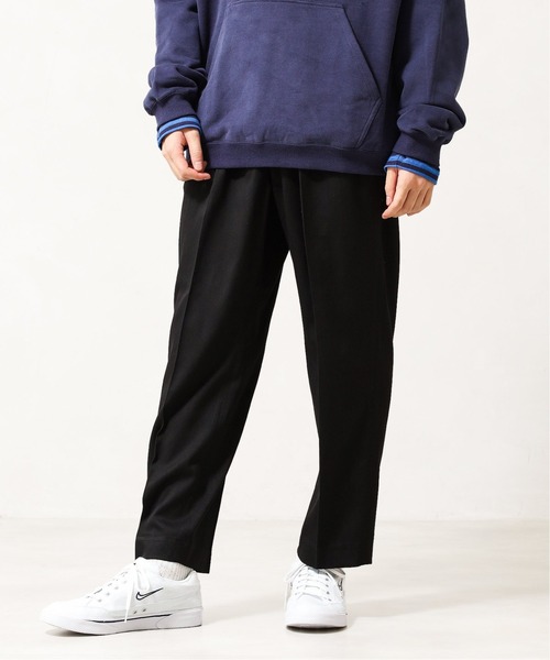 実直なワークウェアブランドとしてお馴染みの【Dickies / ディッキーズ”】定番のチノパンツをベースに、デザイナー管野 寿哉氏のフィルターを通した特別な一着。 ワークウェアにありがちなコットン×ポリエステルの生地ではなく、敢えてウール混のポリエステル生地を採用することで、武骨さを軽減し上品な面構えにブラッシュアップしています。 シルエットは、デザイナーが得意とするテーパードかつ丈を短くしたバランスで、足元がスッキリ見えるモダンな仕上がりかつ2タックの仕様でワイドなシルエットが楽しめます。 ウエストには靴紐を模したボディと同色のドローコードを装着しており、ベルト代わりに結んで着用が可能です。 またこのドローコードは長さを敢えて長めにしているので2重に巻いた後に紐をたらしてアクセントとするスタイリングもオススメ。 上品かつモダンでありながらも、往年の西海岸のスケーター達が履きこなしたリアルスタイリングを彷彿とさせる一本です。 【fosterr / フォスター】 「Four One Seven Team」の頭文字をとり、語尾にerを付けることで「417チームの人」というニュアンスの元にブランドネームを構成した。監修は管野寿哉氏が手掛け、417 EDIFICEのフレンチ要素をベースに今のエッセンスを融合させたNEW LABELとして展開する。 【Dickies / ディッキーズ 】 世界中で大きなシェアを誇るワークウェアブランド。徹底的に労働者のニーズに応えるための尽力が反映された製品は、瞬く間にアメリカ全土に広く浸透し、"874"はワーク系チノの代名詞的存在になりました。 管野寿哉 / KAZUYA SUGANO 90年代から2000年代のストリートカルチャーをバックボーンにした自身のブランド、YSTRDY'S TMRRWを2017年秋冬コレクションよりスタート。普遍的なアメカジアイテムを、繊細な素材使いやディテールのデフォルメによりアップデートしたデビューコレクションは注目を集めた。2021AWシーズンからは417 EDIFICEにて「fosterr」の監修を務める。のストリートカルチャーをバックボーンにした自身のブランド、YSTRDY'S TMRRWを2017年秋冬コレクションよりスタート。普遍的なアメカジアイテムを、繊細な素材使いやディテールのデフォルメによりアップデートしたデビューコレクションは注目を集めた。2021AWシーズンからは417 EDIFICEにて「fosterr」の監修を務める。