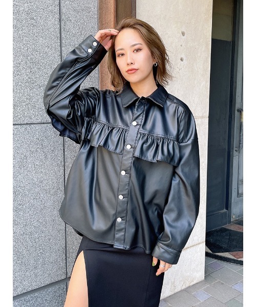 バックスタイルが印象的なシャツJK。 フロントはシンプルにバックスタイルはトレンド感のあるフリル使いが周りと差をつける1着。 ルーズシルエットで幅広いインナー合わせが可能です。