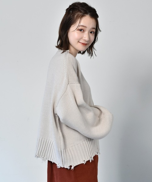アウトリンキングデザインとトレンドのダメージデザインがポイントのニットトップス ニットトップスに表情を与えるアウトリンキングが目をひくニットトップス さらに引き続き今シーズンもトレンドのダメージも加えたラフな抜け感のあるアイテムです。 身幅とドロップショルダーでゆったりとしたサイズですが着丈は長すぎずにスッキリと着られ、ボトムスも選びません。 長めのシャツなどをインナーに合わせてレイヤードスタイルもお楽しみいただけます! ※撮影環境やご覧のモニター環境によって実際の商品とお色味が多少異なってみえる場合がございます。ご理解の程何卒よろしくお願い致します。