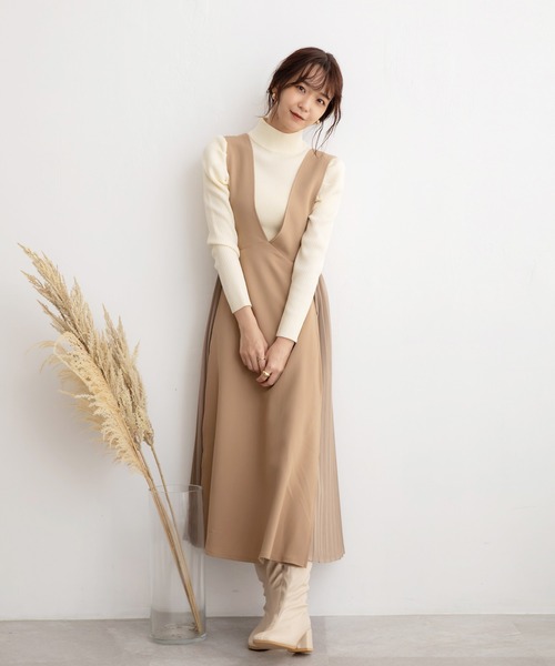 サイドプリーツジャンスカにNEWバージョンが登場。プリーツ使いで女性らしさはそのままに、 Vネックのデザインとゆったりしたシルエットで違った印象に。 シンプルなベージュに加え、ブラウンは細かい千鳥柄とサイドの配色使いをポイントに、 ブラックはデニム生地で仕立てました。 SELECTのブラウス合わせやハイネックパフスリニット合わせがイチオシです。 *色(柄)によって混率変わります。 (ブラック)本体綿95%ポリエステル4%ポリウレタン1% 裏地ポリエステル95%ポリウレタン5% (ブラウン)本体ポリエステル55%レーヨン40%ポリウレタン5% 別布ポリエステル95%ポリウレタン5% 裏地ポリエステル95%ポリウレタン5% (ベージュ)本体ポリエステル70%レーヨン27%ポリウレタン3% 別布ポリエステル95%ポリウレタン5% 裏地ポリエステル95%ポリウレタン5%