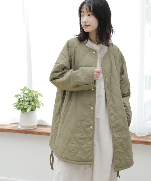Aラインに仕上げた、中綿入りのキルティングジャケット。ポンチョのようなゆったりとしており、カジュアルすぎず女性らしい印象に。裾はヒモで調整できるので、スタイリングによってシルエットを変えてお楽しみいただけます。【素材】アダストリアが独自に開発した、機能性中綿『エアサーマル』を使用。保温性・軽量・嵩高性と、アウターに必要な3つの機能性を兼ねそろえた、注目の合繊素材です。少量の中綿でも、ダウンに近いふくらみと暖かさを体感できます。また、環境に配慮したリサイクルポリエステルを使用し、サスティナブルな原料としても注目を集めています。【スタイリング】パンツでもスカートでもバランスの取りやすいアイテム。軽い着心地なので、季節の変わり目にサッと羽織るのに便利な1枚です。