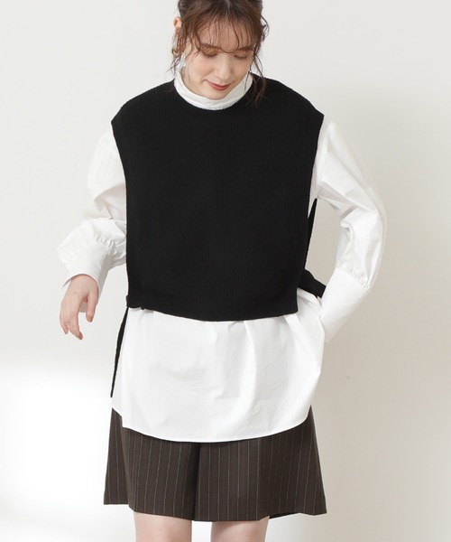 今季らしいハイネックブラウスとニットベストの重ね着で魅せるセットアイテム。レイヤード仕様で作られたデザインですが、別々でも着回しできる優れもの。ブラウスはギャザーを寄せたハイネックと長いカフスでクラシカルな雰囲気のある1枚。後ろネックの釦で着脱できます。ニットベストは深いサイドスリットとリボン結びで抜け感をプラスでき、合わせるインナーによって表情に変化をもたせる万能さが魅力。