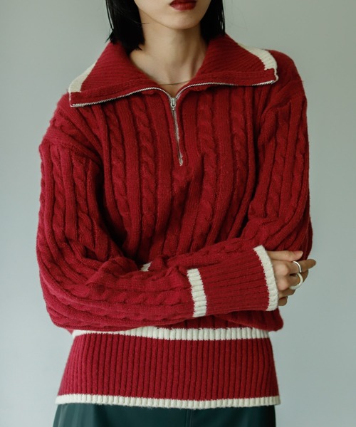 - 2021 VACANCY PRE FALL COLLECTION - ◆トレンドのハーフジップがこなれ感をプラスしてくれる配色ニット 【特徴】 今季トレンドのハーフジップに ケーブル編みの仕様が上品な印象のハーフジップ配色ニット。 ジップを開けてセーラーカラー風にして 首元を開けた抜け感のある着用や、 ジップを閉めてハイネックにして暖かく秋冬らしい着用も可能です◎ 襟元と袖口・裾部分はリブ仕様になっており 配色のラインもさりげないポイントに♩ 【スタイリングポイント】 一枚での着こなしはもちろん ジップを開けてインナーとレイヤードする着こなしで よりこなれ感のあるスタイルに◎ さりげない配色なので ボトムスにカラーアイテムを合わせる カラー×カラーの着こなしもおすすめです。 アウターを羽織ったときに ハイネックが首元から覗くスタイルで 防寒プラスお洒落な着こなしを叶えてくれます。 ・・・・・・・・・・・・・・・・・・・・ 透け感:なし 裏地:なし 伸縮性:ややあり 光沢感:なし 生地の厚さ:普通 ・・・・・・・・・・・・・・・・・・・・ 【お買い物をお楽しみいただく為に】 ▼お気に入り登録をオススメ致します▼ ♡をクリックして下さい。 ・《商品のお気に入り登録》で再入荷通知や、ラスト1点の通知、セールの際の通知も受け取ることができます。 ・《ブランドのお気に入り登録》で新作商品や再入荷など、お得な情報を受け取ることができます! 【ATTENTION】 ※画像の商品はサンプルです。 実際の商品と色味、仕様、加工、サイズ、素材等が若干異なる場合がございます。 ※撮影場所やお使いのモニター環境により若干お色味が異なる場合がございます。 ※製品によっては染料の特性上、湿った状態や汗をかいた状態での長時間の放置、または摩擦により、他のものへ色移りする恐れがありますので、着用時にはご注意下さい。 ※お洗濯は洗濯ネットを使用し、他のものとの混合洗いはお避け下さい。色落ちや色移りの原因となります。 タンブラー乾燥はお避け下さい。 ※風通しがよく、湿気の少ない日の当たらない場所で保管して下さい。 ※また製品加工上、お手元に届く際に匂いが生じる場合がありますが、 ご使用を続けていく事により匂いは軽減されます。 ※ご注文いただいた予約商品のお届け時期の確認は、注文履歴ページより行えます。