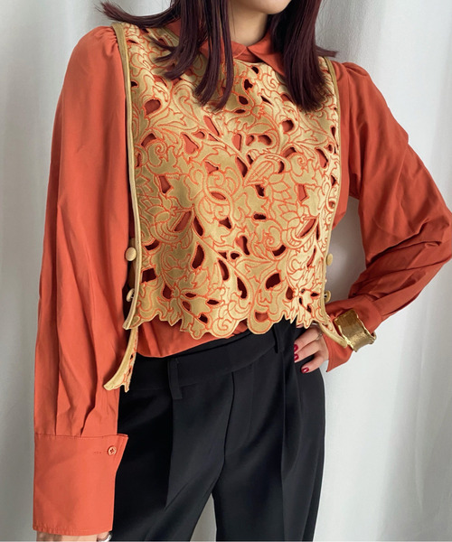 オリジナルのカットワーク刺繍を施した、ベストとブラウスのセットアイテムベロア生地に微配色の刺繍をする事で、AMERIらしい重厚感のある一着に仕上げました。レイヤードの相性を計算したブラウスがセットになっているのも嬉しいポイント。独立しても着用が可能な着回し力も抜群のアイテムです。(滑脱のご注意)この製品に使用している素材は風合いをいかした大変デリケートな素材を使用しており、性質上破損されやすく激しい運動や極度な力が加われば、縫い目が開いたり、目寄れすることがあります。(移染について) この素材は摩擦(特に湿った状態での摩擦)や、汗や雨等で濡れた時は他の衣料や下着、バッグ等に色が移ることがありますのでご注意下さい。