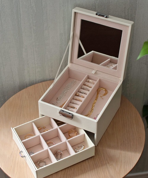 【デザイン】 スタンドミラー付き2段ジュエリーボックス 引き出し付きの二段タイプのジュエリーボックス。 女性を輝かせる『アクセサリー』をきれいに収納。 豊富な収納スペースがある大容量で、色んなジュエリーに対応。 引き出し部分の仕切り収納は、間仕切りが取り外せるので 時計やメガネなどの収納も可能。 フタの部分には、身だしなみのチェックができる大きいミラーがついていて 引っ張り出すとスタンドミラーとして使えます。 専用の鍵が付属されていて、しっかりロックができて安心です。 水に強い合成皮革を使用しているので、 洗面台などの水場でも安心して使っていただけます。 【注意事項】 合成皮革特有のにおいがする場合がござます。 においが気になる場合は一度陰干しされてからご使用ください。 アクセサリー類を収納する際は、水分や液体等が付着した状態で収納しないでください。 ジュエリーによってはまれに変色する場合があります。その際は本品の使用をおやめください。 合成皮革部は劣化したりベタツキや貼りつきが生じることがあります。 火のそばでは使用しないでください。 ◆商品のお気に入り登録◆ 完売カラーの再入荷通知や、ラスト1点の通知、 セールの通知も受け取ることができますので、是非ご登録ください。 ◆ブランドのお気に入り登録◆ 新商品や再入荷などの情報を受け取ることができますので、是非ご登録ください。