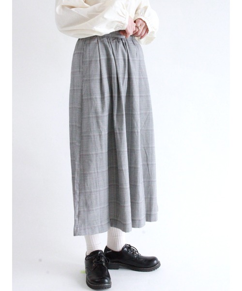 トラッドな表情を漂わせるグレンチェックのスカート。動きのあるギャザーフォルムがソフトな雰囲気に導きます。ウエストをすっきりと見せつつ、ノンストレスな穿き心地のバックゴム仕様。きれいめにもカジュアルコーデにもおすすめな、ワードローブにぜひプラスしたいアイテムです。