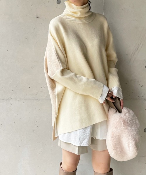 ■2021 AUTUMN & WINTER ITEM■大人の落ち着きカラーで仕上げたバイカラーニット前後でバイカラーに仕上げたおしゃれ感抜群のニット。落ち着いたカラーリングで大人らしい印象に仕上げてくれます。ニットの暖かい着心地はありながらも、ずっしり感が無く軽やかな着心地を実現。ポンチョのようなたっぷりとしたシルエットの為、身体のラインを拾わずリラクシーに着て頂けます。また、ネックラインは締め付け感無く、優しく首に沿うタートルデザインに。スカート・パンツ・ショートパンツと幅広くマッチしてくれるので、この秋冬に重宝すること間違い無し!- POINT -・身体のラインを拾わない・首元の暖かいタートルネック・様々なボトムとマッチ--------------------------------洗濯:洗濯機洗い (弱)透け感: なし裏地: なし伸縮性: あり光沢感: なし--------------------------------【 ♡ をクリックでお得な情報をお知らせいたします 】〈 商品のお気に入り登録 〉 お気に入りアイテムのお値下げ・再入荷・在庫ラスト1点など通知を受けることができます。〈 ブランドのお気に入り登録 〉DOUDOUの新商品や再入荷、セール、クーポン配布などお得な情報を受けることができます。--------------------------------------※ 生産の都合上、お届け時期が前後する場合がございます。※ 掲載画像の商品の色味は、 撮影場所や光の当たり具合などにより色味が異なって見える場合がございます。 また、お客様のお使いのPC・スマートフォン等のモニター環境などにより色味が異なって見える場合がございます。予めご了承の上ご注文ください。 ※ 着用、お取り扱いの際は、商品についている品質表示とアテンションタグを必ずご確認下さい。