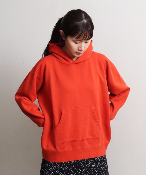 冬に気持ちよく暖かく過ごすスウェットの提案。肩ハギをなくし、前身頃と後ろ身頃が続きになっており、着用すると着丈に前後差が出て、ヒップをすっぽりと包みます。2重のフードで首に沿い、暖かく着て頂けます。袖下の三角マチを身頃と一体化しているので、脇のゴロ付きがなく快適に。製品染め後に、シルク柔軟(純度の高いシルクプロテインで繊維をコーティングする加工)を施しました。裏毛のカサっとしたタッチをなくし、やわらかく肌あたりもしっとり滑らかにしているので、素肌にも気持ちよく着ていただけます。洗濯:手洗い可※グリーンのモデル着用画像は、撮影の環境上青みがかっております。実際のお色味は、置き撮りの詳細画像をご参照ください。※グリーンの着用画像はサンプルです。製品は着丈:-5cm,袖丈:-3cm となります。※取り扱い表示をよくご確認の上、着用をお願いいたします。※撮影画像は、光の当たり具合やモニターの環境により色味が違って見える場合があります。あらかじめご了承ください。※サンプル商品は実際の商品と仕様、加工、サイズが若干異なる場合がございます。
