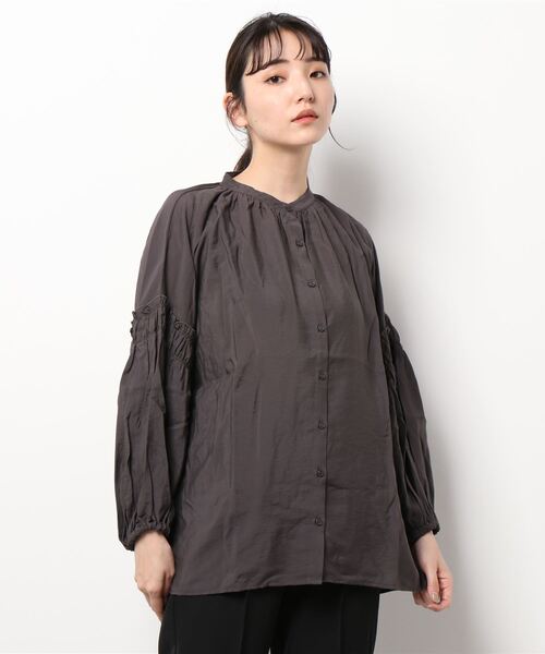 ソフトで優しい雰囲気が女性らしいブラウス。バンドカラーでさりげなくマニッシュなニュアンスを演出します。キュートなデザインのボリュームスリーブが、旬顔なコーディネートに。今っぽい着こなしバランスが完成する、ボトムスを選ばずに活躍してくれるアイテムです。