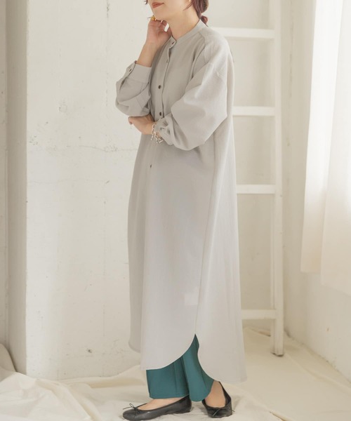 きちんと感のあるバンドカラーを採用したロング丈のシャツワンピース。独特なシワ加工を施した生地で仕立てた、レトロライクな風合いをお楽しみいただける1着。袖の長さもやや長めにデザインし、抜け感のあるディテールにもこだわりました。 ※商品画像は、光の当たり具合やパソコンなどの閲覧環境により、実際の色味と異なって見える場合がございます。予めご了承ください。 ※商品の色味の目安は、商品単体の画像をご参照ください。 ----------------------------- 透け感 :ややあり(GRY, IVO) 伸縮性 :なし 裏地 :なし 光沢 :なし ポケット :なし -----------------------------