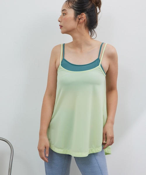【デザイン・シルエット】 ブラとキャミソールがドッキングした、重ね着風の便利な一枚。 気になる腰回りはしっかりカバーしてくれるシルエット。 フィットネスやヨガなどアクティブなシーンではもちろん、通常のワードロープでも重宝するアイテムです。 シーンを選ばず着用できるブラック、カラー配色が楽しいライトグリーンとピンクの3色展開。 【素材】 スルスルと気持ちの良い肌触り。ハイストレッチのメッシュ生地で通気性も◎。 【モデル着用サイズ】 身長:166cm 着用サイズ:FREE バスト:79~85cm、アンダー65cm~73cm 対応カップサイズ目安 :A75 B70 B75 C70 D65 D70 D75 ーーーーーーーーーーーーーーーーーーーーーーー 裏地:あり(カップ部分) 光沢感:なし 伸縮性:あり 厚み:やや薄い その他仕様:カップ付き(取り外し可) ーーーーーーーーーーーーーーーーーーーーーーー 【おすすめのスタイリング】 タイツ合わせもしくはアスラウンジパンツなどカジュアルパンツに合わせて華やかなトレーニングスタイルに。 【用途】 トレーニング/フィットネス/ヨガ/ウォーキング/フィットネス/ピラティス ※実際の商品はお客様のお使いの端末や閲覧環境により、写真と実物の色味や質感が多少異なって見える場合がございます。予めご了承ください。 ※画像の商品はサンプルです。実際の商品とは仕様・加工・サイズ・素材が若干異なる場合がございます。 ※伸縮性に富んだ素材のため、多少のサイズ誤差が生じる場合もございます。