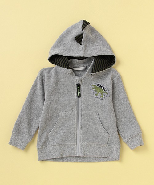 前後どちらから見てもインパクトを放つ恐竜モチーフのジップパーカです。 着脱式のフードには背びれや裏ボーダーのアクセントを効かせ、ユニークな仕上がりに♪ 前後のティラノザウルスのワッペン&サガラ刺しゅうで視線キャッチ効果も抜群なアイテムです。【透け感】透けない【生地の厚さ】普通【伸縮性】あり【裏地】なし【ポケット】あり