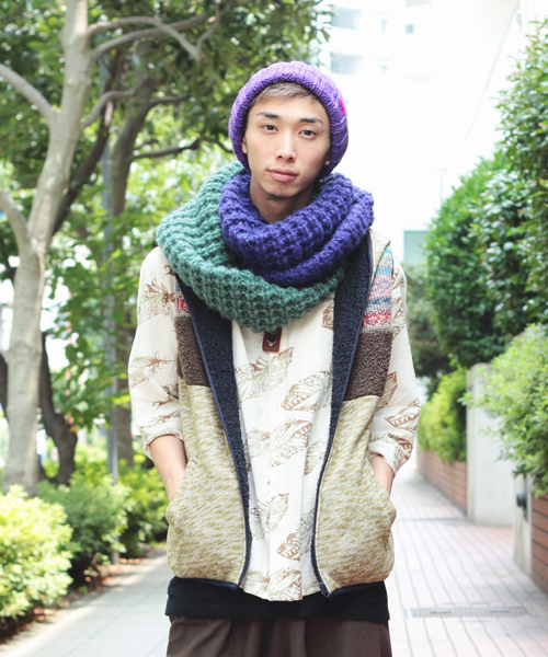 カラフルなジャカード生地、ボア、裏毛素材など複数の生地を組み合わせました。ジッパーはフードの先まで上がる仕様です。アームホールと裾には伸縮ゴム入り。内側はボア素材です。 model H178 B88 W72 H86 着用サイズ:FREE