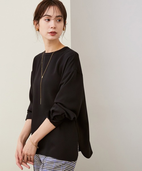 【素材】ポリエステルのダブルクロスで、ややストレッチ性のある素材を使用。シーズンレスでイージーケアな素材感です。【デザイン・シルエット】ドロップショルダーで抜け感のあるTブラウスです。あえて襟ぐりを太めの切り替えたり、裾をシャツカットにすることで、きれいめ過ぎずモダンな女性らしいエフォートレスなシルエットに仕上がっています。【カラー】シックなキャメルと白、クロの3色展開。白はブラウスのみの展開になります。【おすすめのスタイリング】単品使いだけではなく、同素材同色のパンツ、ジャケットを展開していますので、セットアップとしても着用可能ですし、上からジャケットを羽織ることも可能です。パンツと合わせやすい着丈感ですが、前裾だけタックインするのもおすすめです。----------------------------透け感:なし裏地:なし伸縮性:少しあり光沢感:なし生地の厚さ:中肉ポケット:なしポケット数:なし洗濯方法:洗濯機可開き:ファスナー----------------------------【モデル情報】モデル身長:167cm 着用サイズ:38※画像の商品はサンプルです。 実際の商品と仕様、加工、サイズが若干異なる場合がございます。※室外で撮影している画像は、光の影響で色味が若干異なって見える場合がございます。※商品の入荷状況は、店舗までお問い合わせをお願いいたします。店舗での商品のお取り扱いについてROPE'の商品は、ROPE'実店舗のみの取り扱いになります。