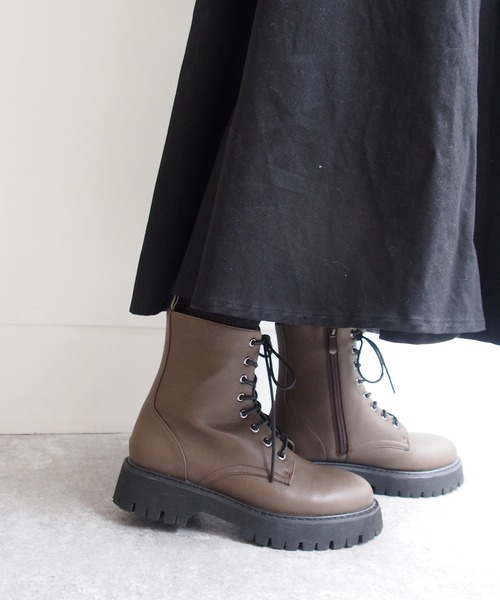 2021 - Winter - ≪新ソールがインパクト大!厚底レースアップブーツ≫ インパクトのあるトラックソールがポイントの編み上げブーツ。 メンズライクなベースデザインの中にもゴツ過ぎない可愛らしさもある顔つきでバランスの取れた一足に。 特にトレンドの「アイボリー」は、ソールもハトメ(ヒモを通す部分の金具)も同色にして、全体をふんわりとした白系トーンにまとめていてオススメです。 新しいソールは、ボリューム感との対比で脚が細く見え、厚底でスタイルアップ効果も抜群。 内側ファスナーで脱ぎ履きラクチン。 厚みのあるソールは地面の衝撃を吸収してくれる上、角度のついたトゥスプリングが返りもよく、歩きやすさも兼ね備えています。 コーデのポイントは… 韓国系モードスタイルのような全身黒コーデから、淡色ワントーンコーデにも合わせやすいデザイン。 少しやわらかく合わせたい方はフェミニンな甘辛スタイルがオススメ。 レディライクなニットスカートやワンピースにコンバットブーツの組み合わせで、ハード過ぎないバランスに。 靴下でボトムスとの丈感を調整するのもオススメです。 卒業式・成人式の袴・着物コーデにも。 【片足の重さ】約 505g スタッフ着用レビュー <スタッフ・Natsumi.I> 足長 :23.3cm 足囲 :22.8cm / ワイズD(標準) 甲の高さ:5.7cm / 低め 足幅も甲の高さも標準のエジプト型です。くるぶしが低めで、外反母趾気味。 普段は23.5cmを着用しますが、スニーカーやブーツは余裕をもって24.0cmを着用します。 Mサイズを靴下で着用しました。 足長、幅、共にちょうどよかったです。 筒周りは紐で一度調節したら、内側ファスナーで開け締めできるが楽でいいです。ソールも安定感があります。 - byあしながおじさん - 急速に移ろっていくファッショントレンドをもっとライトな感覚でつかまえていける、そんなキャッチーな立ち位置で。 “あしながおじさん”がつくってきたカジュアルシューズの楽しさをもっとたくさんのお客さまにお届けするために。 ■商品について 画像の商品はサンプルです。 実際の商品と仕様、加工、サイズ、素材が若干異なる場合がございます。予めご了承ください。 トップの画像は、光の具合で色味が違って見える場合があります。商品の色味は、スタジオ撮影の画像をご参照ください。 サイト上のカラー名と、お届け商品に記載されているカラー名が異なる場合がございます。 厳選された素材を使用しておりますが、雨に濡れたり、汗による湿気、乾燥状態での摩擦により革が色落ちし、薄い色の衣服、靴下などに色移りする可能性がございます。ご使用の際には十分ご注意くださいますようお願い致します。 ■返品について 商品の性質上、ご着用後のご返品については お受けすることができません。あらかじめご了承ください。修理依頼は、カスタマーサポートセンターお問い合わせ「ご注文に関するお問い合わせ」までご連絡ください ◆気になる商品は「お気に入り」登録を◆ ハートマークをクリックし、お好きなカラーを選んでお気に入りに登録すると入荷情報や残り1点の通知、完売カラーの再入荷、セール情報などを受け取ることができます。