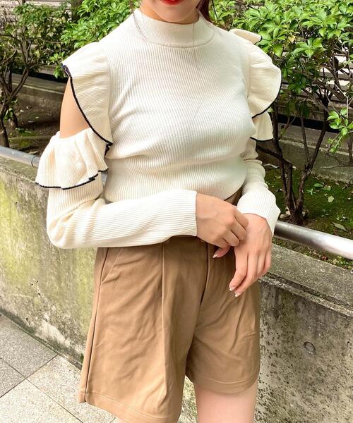 2021 秋アイテム コンパクトなシルエットでスタイルアップを叶えるニットトップス。 配色のフリルをたっぷりあしらい、レディな1枚に仕上げています。 抜け感のあるオープンショルダーデザインも◎。 顔周りをすっきり見せてくれるモックネックとボリュームフリルの組み合わせで、メリハリのある着こなしが完成します。 程よい裾丈はトップスインスタイルで着こなすのもおすすめ。 ・ニット製品で生地が伸びやすいため、サイズに若干の誤差が生じる場合がございます。予めご了承くださいませ。 【以下ベージュ参考。カラーにより多少の誤差あり】 ・透け感:やや透ける ・伸縮性:あり ・生地の厚さ:薄い ・裏地:なし