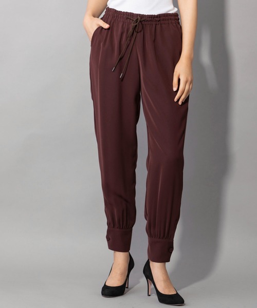 □2021 AUTUMN & WINTER COLLECTION□◆バツグンの穿き心地と美シルエットを兼ね備えたテーパードパンツ◆<MATERIAL>しなやかでとろみのある素材は、ミクロクレーターという、微細な穴が沢山開いた糸を使用することにより、ポリエステル特有の光沢を極限まで抑えたマットな見た目で、高級感がある仕上がりになっています。ほんのりストレッチが効いているので、タイト目なシルエットでも、ストレスなく着用いただけます。キレイめ素材ながら、イージーケアなのも嬉しいポイントです。オールシーズン着用いただける素材感になっています。<DESIGN>マットで高級感を感じられるポリエステル素材で上品な落ち感が大人っぽいキレイめパンツです。パンツの裾にカフスを付けて絞り、ドレープを作りながらバルーンのような丸みのあるシルエットに仕上げたパンツです。太もも辺りは程よくゆったりめのシルエットで、裾のカフスで足首が引き締まって見えるので、メリハリが出てスタイル良く決まります。カフス部分は、ほどよく足首に沿うサイズ感なので、ストレスなく穿いていただけます。また、とろみと落ち感のある素材なので、裾も膨らみ過ぎず女性らしく大人っぽい印象で穿いていただけます。綺麗めだけでなく、カジュアルなアイテムとも合うので、色々と楽しめるアイテムです。<COLOR>■ブラック:程よく光沢があり、軽さのある品の良いブラック。細見えするカラーです。■ダークベージュ:赤みを抑えた優しい印象のベージュカラーです。ほどよく女性らしく、こなれた印象も演出できるカラーです。■カーキ:グリーンの色みが程よく調和された明るめのカーキです。大人カジュアルの着こなしがお好きな方におすすめのカラーです。■ボルドー:赤紫色に深みを加えたボルドーです。落ち着きのある上品なカラーです。<SIZE>■普通体型157cmのスタッフはXSサイズを着用しています。■普通体型160cmのスタッフはSサイズを着用しています。■165cm以上でもやせ形の方はSサイズで問題なく穿けますが、骨盤がはっていたり、長めの丈感がお好みの方はMサイズをおすすめします。※ウエストは3cmずつ大きくなり、丈は2cmずつ長くなります。*お取扱いについては、商品についております品質表示、アテンションタグにてご確認ください。洗濯:洗濯機使用可.............................≪INFORMATION ≫............................▼商品のお気に入り登録▼『♡』マークを押してお気に入り登録して頂いた商品は、セール開催の通知やクーポン発行などのキャンペーンなど、お得な情報をいち早く受けとる事が出来ますので、ぜひご登録ください。