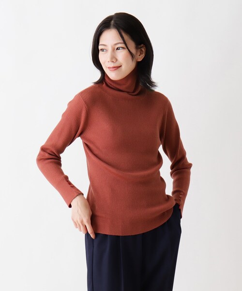 ☆☆☆さりげない手元のスリット&ボタンがポイント!使えるベーシックタートルネックニット☆☆☆柔らかな肌触り、程よい伸縮性が心地よい、ちくちくしにくく、洗濯機で洗えるベーシックなリブ組織のニット。女性らしく繊細な雰囲気を醸し出す小さ目のボタン、ピタピタしすぎず身体に程よくフィットする美シルエットなど、シンプルな中にもこだわりを詰め込んでいます。着回し力も期待でき、オン・オフシーン、エレガント~カジュアルテイストまで広範囲にOK!8色カラー展開で、色ち買いしたくなるベーシックなアイテムです。※アイボリー(004)はやや透け感があるため、インナーの着用をおすすめします。■サイズ大きいサイズ04(LL以上)展開あり。※05(3L)サイズはWEB限定サイズです。■スタイリング薄手のタートルニットは、スウェットやゆるニット、ワンピースなどにレイヤードすれば、こなれ感+防寒対策もばっちり。スッキリとしたシルエットのベーシックなアイテムなので、ジャンスカやサスペンダー付きのボトム、ハイウエストボトムなどとも好相性!きれいめスタイルからカジュアル、オフィスまで、オンオフ問わず着ていただけます。薄手の生地でスーツの下にも楽に着ていただけます。シンプルにデニム合わせでも、袖のボタンのデザインがさりげなく見え、オシャレ度をUPしてくれるポイント。モデル情報:身長167cm B78 W62 H88 着用サイズ:02(M)店舗へのお問い合わせ商品番号:C62-13307●製品寸法:02(M):着丈59cm B78cm 袖丈54cm 首周り17cm タートル部分H16cm 肩幅34cm03(L):着丈61cm B81cm 袖丈55cm 首周り17cm タートル部分H16cm 肩幅35cm04(LL):着丈63cm B84cm 袖丈56cm 首周り18cm タートル部分H16cm 肩幅36cm05(3L):着丈64cm B87cm 袖丈56cm 首周り18cm タートル部分H16cm 肩幅37cm備考: