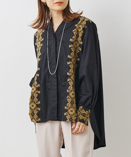 繊細な刺繡デザインが高見えなシャツブラウス【ポイント】●フロント&カフスに施した刺繍デザインが目を引く大人シャツ●細やかで繊細な刺繍が高級感のある高見えポイント●V開きでノーカラーのネックラインが顔回りをスッキリ見せてくれる効果も●ボタンの見えないフライフロント仕様でスマートな着こなしに●後ろが長めの丈感なのでお尻回りまでしっかりカバー●柔らかい肌触りのインド綿を使用しており、優しい着心地【オススメコーディネート】・テーパードパンツやナロースカートなどのスッキリシルエットのボトムにフロントをタックインした大人のきれいめカジュアルスタイル・前ボタンを開けて羽織として着用するのも◎--------------------------------------------------------------生地の厚さ:薄手伸縮性:なし透け感:あり裏地:なし洗濯方法:ご自宅での洗濯可--------------------------------------------------------------※商品のお取り扱いに関しましては、商品に付属のアテンションカード、洗濯ネームをご覧ください。※撮影場所やお使いのモニター環境により若干お色味が異なる場合がございます。特にロケの撮影では明るく見える傾向にございます。 ※サイト上ではフリーサイズの表記ですが、商品タグにはMサイズと表記されている場合がございます。その場合、ワンサイズでのご用意となりますのでサイズミスなどではございません。詳しいサイズはサイズスペックをご確認いただきますようお願い致します。※サイト上でのカラー名とお届けした商品に記載されているカラー名が異なる場合がございますので予めご了承ください。--------------------《Information》--------------------【商品のお気に入り登録】→カートに入れる右側の【♡マーク】をクリック!完売カラーの再入荷通知やラスト1点の通知、セールの通知を受け取ることができます。【ブランドのお気に入り登録】→ブランドタグのページから【♡お気に入りショップに追加】をクリック!新商品や再入荷など、ブランドのお得な情報をいち早く受け取ることができます。是非ご登録頂き、お買い物をお楽しみください◎<返品・キャンセルについて>・着用・洗濯後の返品は致しかねます。・商品到着後、着用前に商品を確認して頂きますようお願い致します。
