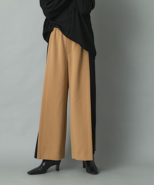 サイドのプリーツがポイントのワイドパンツ●デザインサイドにプリーツを施したデザインが印象的なワイドパンツ。カジュアルに見えがちなワイドパンツにきちんと感をプラスしてくれます。きれいめスタイルながらもウエストはゴム仕様でリラクシーなだけでなく、穿きやすいのも嬉しいポイント。カラー切り替えで縦のラインが強調されるのですっきりとしたスタイルに魅せてくれます。●おすすめコーディネートいつものロンTやニットに合わせてシンプルに着こなすだけでおしゃれに見えます。足元はブーツで季節感を入れるのがポイント。●素材ポリエステル87% ポリウレタン13%別布:ポリエステル100%・上品見えする素材感洗濯方法:ドライクリーニング透け感:なし裏地:なし伸縮性:ややあり生地の厚さ:普通ウエストゴム:あり光沢:ややありファスナー:なしポケット:なし==============================【注意点】※画像の商品は光の照射や角度、お使いのモニター環境により、 実物と色味が異なる場合がございます。 あらかじめご了承下さいませ。==============================【お買い物をもっと便利に楽しく♪】『♡』をクリックでお気に入り登録・「商品のお気に入り登録」で・・・ラスト1点や再入荷の通知が届きます。登録して頂いた商品だけが対象となる、あなただけのタイムセールが開催されることも!・「ブランドのお気に入り登録」で・・・新商品や再入荷など、いち早くブランドのお得な情報を受け取ることができますので、ご登録をおすすめします! ==============================
