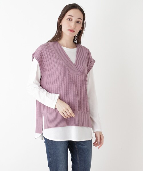 【デザイン】お得なニットベストとロンTEEのSETアイテム。トレンドのニットベストは表情のある編み柄がポイントで深いVネックが大人っぽく仕上がる1枚に。SETになってるロンTEEでスタイルが完成するので、トレンドアイテムが簡単に取り入れられます。ボトムスを選ばず何にでも合わせやすく、色々なレイヤードスタイルを楽しめます!【生地感】インナーはやわらかみが程よいソフトな風合いです。ニットベストはやからかなコットンブレンド素材を使用しています。※こちらの商品はやや透け感があるため、インナーの着用をおすすめします。【サイズ】大きいサイズ(LL)の展開あり。※04(LL)サイズはWEB限定サイズです。こちらの商品は主に冬に着用いただける商品です。モデル情報:身長165cm B80 W59 H87 着用サイズ:02(M)店舗へのお問い合わせ商品番号:C62-13313●製品寸法:02(M):アウター着丈67cm アウターB108cm アウター肩幅55cm インナー着丈70cm インナーB104cm インナー袖丈49cm インナー肩幅51cm03(L):アウター着丈68cm アウターB112cm アウター肩幅57cm インナー着丈71cm インナーB108cm インナー袖丈51cm インナー肩幅53cm04(LL):アウター着丈69cm アウターB116cm アウター肩幅58cm インナー着丈72cm インナーB112cm インナー袖丈52cm インナー肩幅54cm備考: