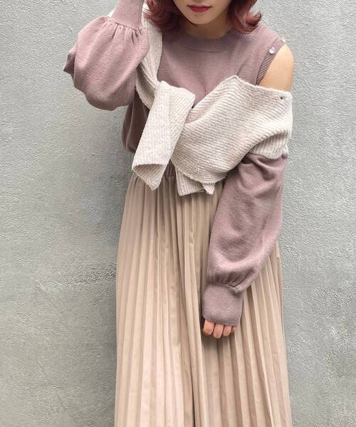 肩からショールを羽織ったようなデザインが特徴的で、注目の的間違いなしのニット☆ ショルダーボタンを外すと、肩だしスタイルになりフェミニンな印象に早変わりです♪ ボリューム袖ともちっとしたしっかりニット素材が、着心地のいい1枚◎