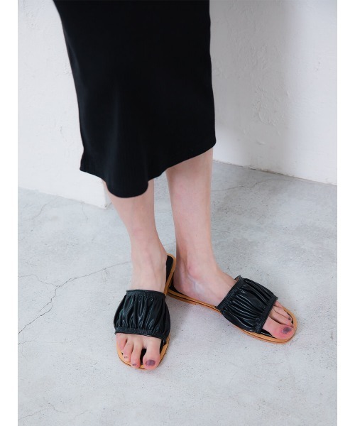 フリルギャザーのデザインがポイントのflat frill sandals。 フラットヒールで歩きやすく、シンプルなコーディネートに合わせやすい一足。