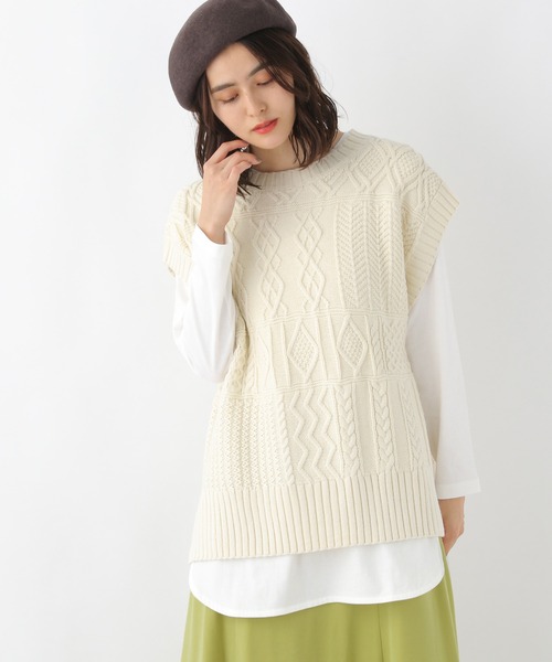 今期マストトレンドのベスト パッチワーク風の編み柄がポイントのケーブルベスト。ほっこりした印象になりすぎないようにケーブルの量を調整したので、すっきりと大人っぽく着られるでデザイン。シャツやTシャツとのレイヤードはもちろん、柄のワンピースとのレイヤードもトレンド感があっておすすめです。