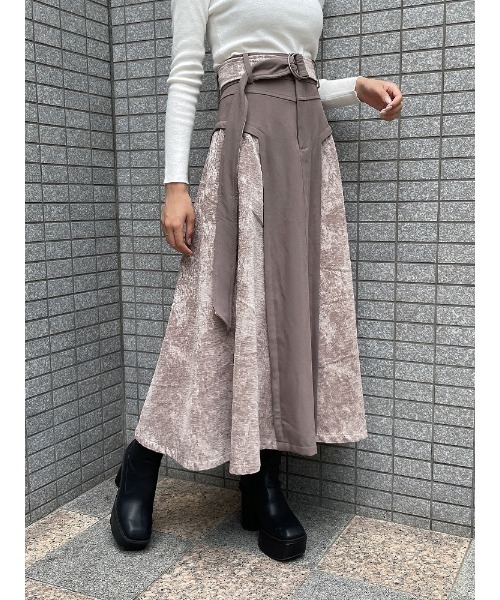 2素材の生地で切替えたハイウエストロングSKは、両サイドにドッキングされたベロアジャガードがポイント。 付属のベルトは裏表で柄と無地の2wayで使用できます。