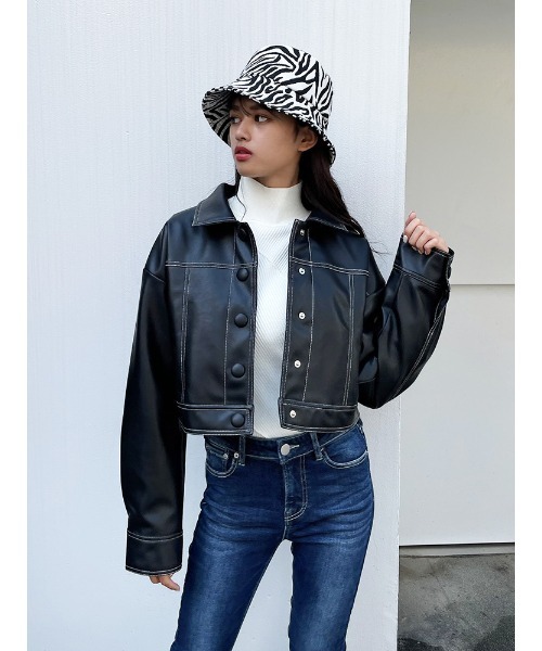 ステッチが配色になっているフェイクレザーJK。 ドロップショルダーとショート丈がトレンド感のある1着です。