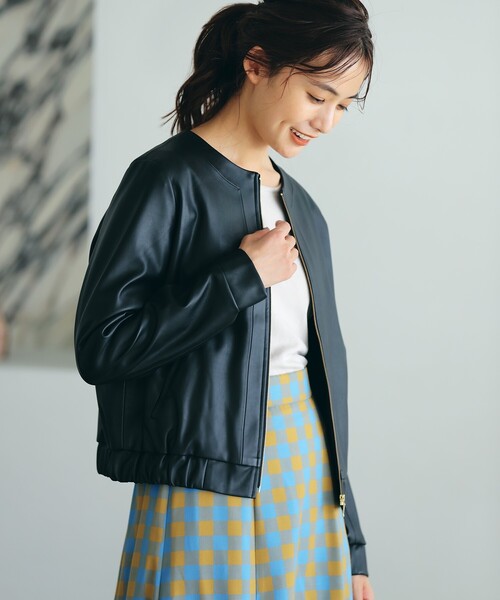 【デザイン】 トレンドの合皮レザーを使用したジャケットです。 ノーカラーデザインで、女性らしいスタイルにもより合わせ易いです。 ワンピースやスカートと合わせる等、甘めのコーデで合わせるのがグローブスタイルのおススメです。 ポケット数:横×2 【生地感】 セミマットな質感とソフトで滑らかな合皮を使用することでハード過ぎない印象に仕上げています。 ※裏地あり ※01・04・05サイズは、WEB限定となります。 こちらの商品は主に冬に着用いただける商品です。 モデル情報:身長162cm B72 W57 H82 着用サイズ:02(M) 店舗へのお問い合わせ商品番号:768-43012 ●製品寸法: 01(S):着丈50cm B106cm 袖丈59cm 肩幅37cm 02(M):着丈51cm B109cm 袖丈60cm 肩幅38cm 03(L):着丈52cm B112cm 袖丈61cm 肩幅39cm 04(LL):着丈53cm B115cm 袖丈62cm 肩幅40cm 05(3L):着丈54cm B118cm 袖丈62cm 肩幅41cm 備考:重量:02(M)約580g(サンプル重量)