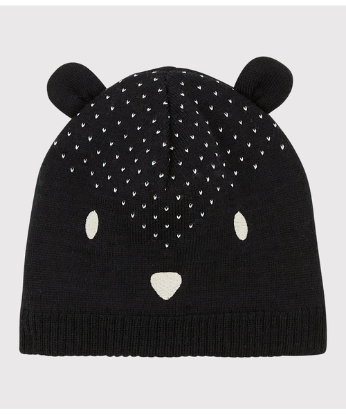 アニマルモチーフの耳付きニットキャップです。環境や動物にやさしいやわらかなウール素材が、ベビーの頭部を温かく守ります。揃いのマフラーやミトンと合わせたギフトにもおすすめのアイテムです。