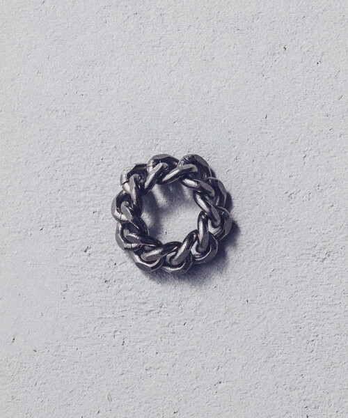 "カッティング カーブチェーン リング"多彩なデザインチェーンが揃ったコレクション。カッティングを施したように、面で光を反射させるチェーンがソリッドな輝きを見せるカーブチェーン。表面の削ったようなラフな仕上がりが、ヴィンテージライクなニュアンスを添えます。チェーンリングとの合わせはもちろん、パールやストーンなどどんなアイテムにも合わせやすくマルチに活躍します。カジュアルにはもちろん、シャツやジャケットなどのきれいめスタイルの外しにもぴったり。親指に着けるサムリングとしてもおすすめです。真鍮素材を用いることで、ボリュームがありながらも軽い着け心地も魅力のアイテムです。※チェーンを編み込む際のピッチの違いにより、サイズの個体差がございます。Sサイズ: #8~#10相当Lサイズ: #15~#17相当LLサイズ: #22~#24相当サイズ直し:不可※ボリュームのあるチェーンリングは通常のリングに比べフィット感が強いため、普段着用しているものよりも1サイズ大きいものをお勧めいたします。