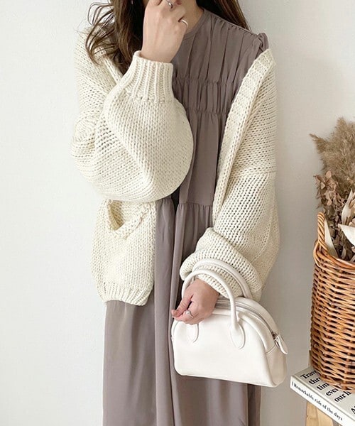 ざっくりと編まれた着心地の良いニットカーディガン。 たっぽりな袖にルーズな印象のポケットにこだわり どんなアイテムにも合わせやすいように作りました。 ほっこり暖かく秋冬に大活躍な1枚です◎