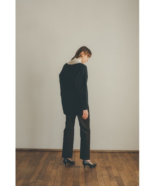 CLANE初期に作成したリバイバルニット。フロントはベーシックなVネックデザインですが、後ろが透かし編みになっているのでバックスタイルがとても映えるニットです。ベーシックながら、一癖あるCLANEらしいデザインニットに仕上げました。抜いて着る着方が抜け感がありオススメです。