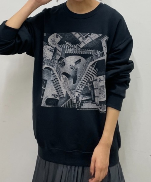 フランスの錯視画家 M.C ESCHERの作品がプリントされたスウェット 1953年に発表されたRelativity(リラティビティー)は、「相対性」の意味が表す通り、様々な角度からの他者との関係性を描いた作品です。 Mサイズと、XLサイズの2サイズ展開で、 Mサイズはスカートと合わせてもバランス良く着れ、XLサイズは女性がゆったりと着て頂いても素敵ですし、男性の方にもおしゃれにコーディネートをして頂けます。 【マウリッツ・コルネリス・エッシャー】 視覚の魔術師とも称されるフランスの錯視画家「M.C ESCHER(マウリッツ・コリネリス・エッシャー)」は遠近法や透視法を逆手に取った不可能な構造など緻密に計算された不可思議な世界が特徴で、『トロンプ・ルイユ(騙し絵)』の画家としては世界一の知名度を持つアーティストです。 建築をモチーフとした幾何学的な騙し絵や無限回廊、永遠に流れる滝の家など不思議な騙し絵は見たことある方も多いと思います。 ■商品品質 ・裏地:なし ・透け感:なし ・伸縮性:あり ・厚さ:普通 ・洗濯:洗濯可 ◆商品画像について◆ 店頭及び屋外での撮影画像は、光の当たり具合で色味が違って見える場合がございます。 また、お客様のお使いのモニター環境により、実物と色味が異なる場合がございます。あらかじめご了承下さいませ。 ◆お気に入り登録について◆ ▽気になるアイテムは、ハートマークをクリックしておくことで、スムーズにお買い物が楽しめます。 ・ラスト一点のお知らせ ・再入荷のお知らせ ・予約商品が店頭に入る際にお知らせ ・SALEのご案内