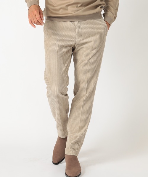 【細畝と太畝が作り出す表情豊かな親子コーデュロイのストレッチパンツ】 一般的なコーデュロイとは違って、細畝と太畝が交互に並ぶ"親子コーデュロイ"のパンツ。コットン100%とはまた違った雰囲気と穿き心地が楽しいパンツは、コットン以外にポリエステルとモダールを混紡することでソフトでしっとりとした風合いに。より良い穿き心地を実現するために腰回りはほど良くゆとりを持たせて、裾にいくにしたがってテーパードをかけています。足のラインがきれいに見えてすっきりとした印象を与える一本に仕上がりました。 【素材】 ポリエステル52%×コットン29%×モダール18%×ポリウレタン1%の計算された混紡率で作られた素材です。コーデュロイの風合いとストレッチが効いた穿き心地の良さを楽しんでください。 【コーディネート】 秋はニットやカーディガン、冬にはレザーブルゾンで洒脱な休日スタイルが完成します。おすすめのニットはブランド品番:M0113KSW02、ブルゾンであれば、ブランド品番:M0113FJM03が好相性。 【カラー】 ナチュラルで柔らかい印象の『エクリュ』 汎用性が高く、どんなカラーとも好相性な『ブラック』 【サイズ表記に関して】 商品タグにはサイズ部分に数字が表記されています。 01はSサイズ、 02はMサイズ、 03はLサイズを表します。 モデル 身長184cm 胸囲95cm ウエスト78cm ヒップ94cm 着用サイズ:03(L) ※着用画像は光の加減等で仕様が異なる場合があります。 ※着用画像はサンプルのため仕様が異なる場合があります。