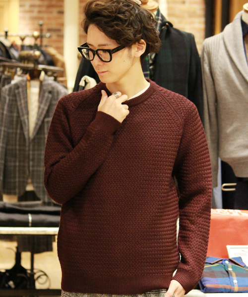 立体的な編込みが特徴のクロスケーブルニット。ラグランスリーブでゆったりとした柔らかな印象を与えています。一枚でもメインアイテムとして活躍いただけます。 店舗にお問い合わせの際は下記の品番、商品名を スタッフにお伝え下さい。 品番14080300506130 商品名クロスケーブル C/N P/O model H182 B92 W71 H90 着用サイズ:46 model グリーン・ボルドー H184 B87 W71 H90 着用サイズ:46