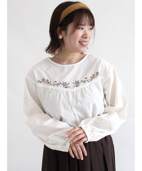 ヨークにあしらった花模様の刺繍が可憐な表情を演出するブラウス。ギャザーたっぷりのふんわりシルエットも、女性らしい優しげな雰囲気を漂わせます。綿100%素材のナチュラルな風合いとさらっとした着心地の良さも嬉しい◎カジュアルにもガーリーにもコーデが楽しめる、大人可愛いアイテムです。
