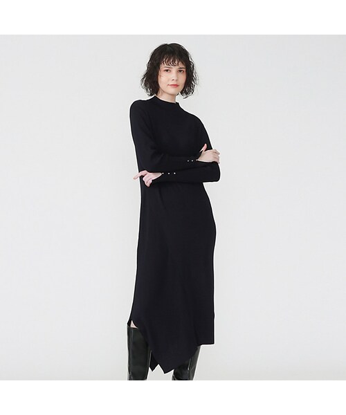 アシンメトリーなデザインが魅力のサイドジップスリットニットドレス。【素材】レーヨン×ナイロンの強撚糸を使用しました。さらりとした編地ですので、長いシーズン着用いただける上に、ニットならではの快適な着心地が魅力です。【シルエット/デザイン】程よくフィットするシルエットで、ボディラインを綺麗に魅せてくれます。アシンメトリーに切り替えられた編地変化が表情豊かで、流れるような変形ヘムラインが女性らしく上品な佇まいに。長めのジップを使用していますので、スリットの開き加減はお好みでお楽しみいただけます。【スタイリング/その他】ワンピースとしての着用はもちろん、サイドのジップを開けて、プリーツスカートやデニム、ワイドパンツなどのボトムスとのレイヤードスタイリングも叶う優れもの。様々なアイテムとの合わせで表情がかわり、着こなしに奥行きを与えてくれる汎用性の高いニットドレスです。